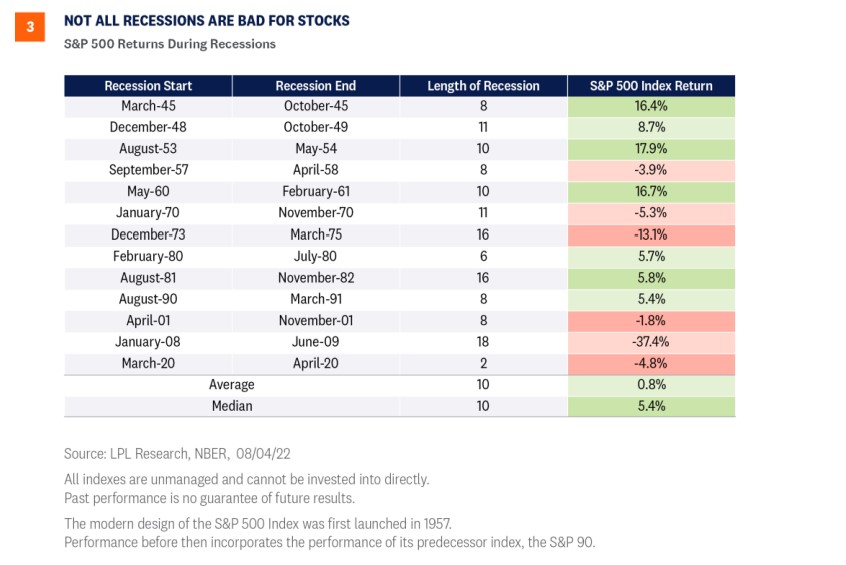 Market strategists and pundits make the relationship between recessions and the stock market seem binary, but each economic contraction is different and has different effects on earnings. That said, it is still instructive to look at what stocks have historically done during recessions to get an idea of potential stock market scenarios.